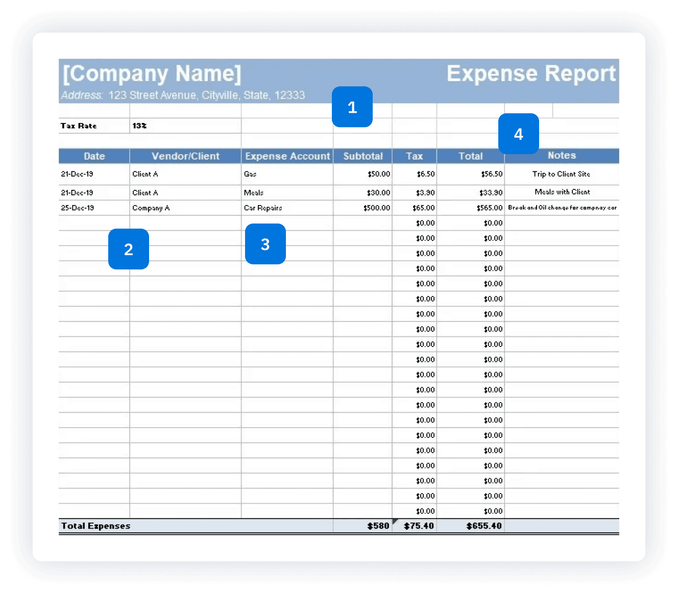 These include your company’s name, address, and contact information, as well as the information of the business owner or employee creating the expense report.