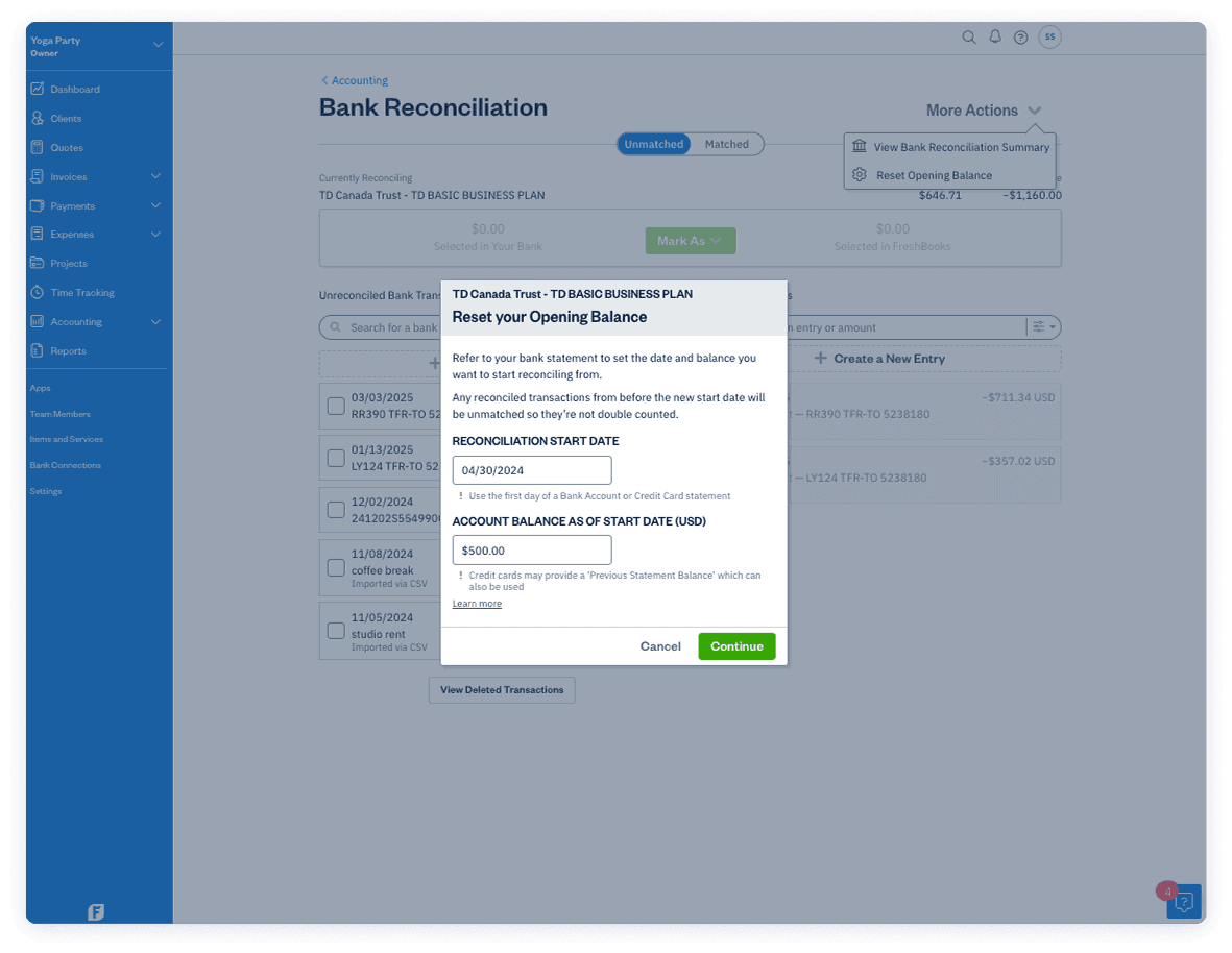 Speaking of reconciliation, direct bank connections previously limited owners to importing their most recent 90 days of transactions into FreshBooks. Now, you can set a client’s bank reconciliation start date to any date you want—even before the earliest their imported bank transactions—and manually import historical data via CSV.