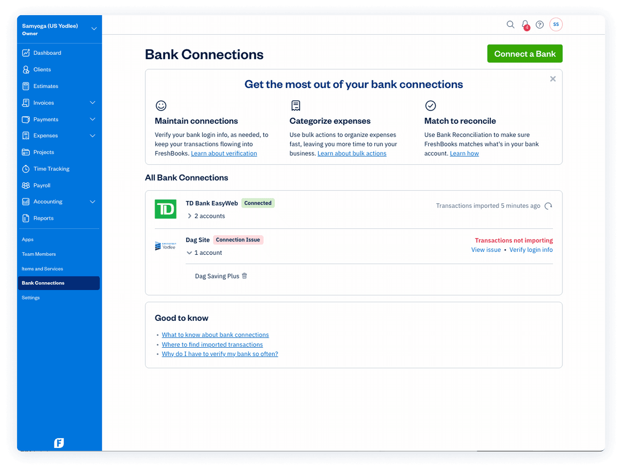 To keep connections seamless, actionable troubleshooting tips can help owners and accountants keep their books on track. View real-time connection statuses, get insights into potential connection issues, and easily access support right within a client’s FreshBooks dashboard. The improved bank connection experience gives you and your clients a more stable and transparent way to keep their books up to date.