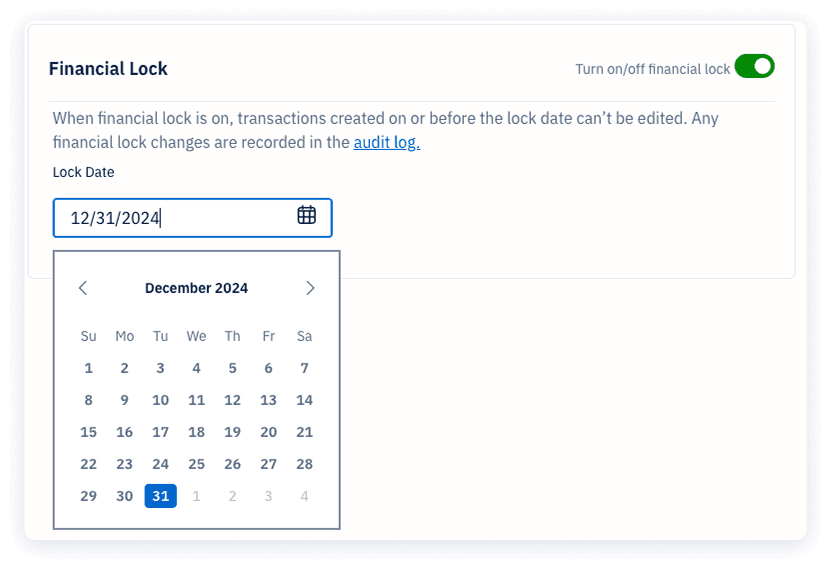 Once you’ve wrapped everything up for an accounting period, you can turn on Financial Lock to prevent unintentional changes to any entries during the previous accounting period. It gives you total peace of mind that you—or your clients—won’t accidentally create a bookkeeping mess.