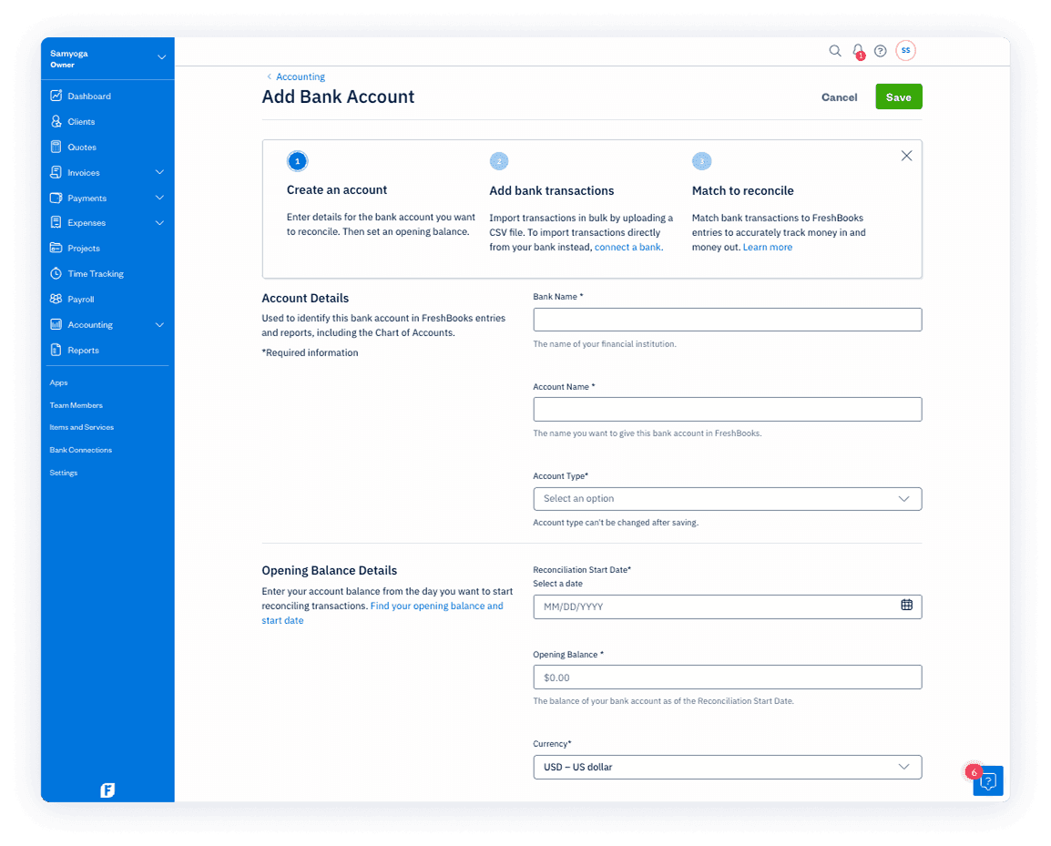 Just head to the Accounting tab of a client’s FreshBooks account and create a bank account. Then you can easily set a starting balance and upload and match bank transactions to keep client books organized.