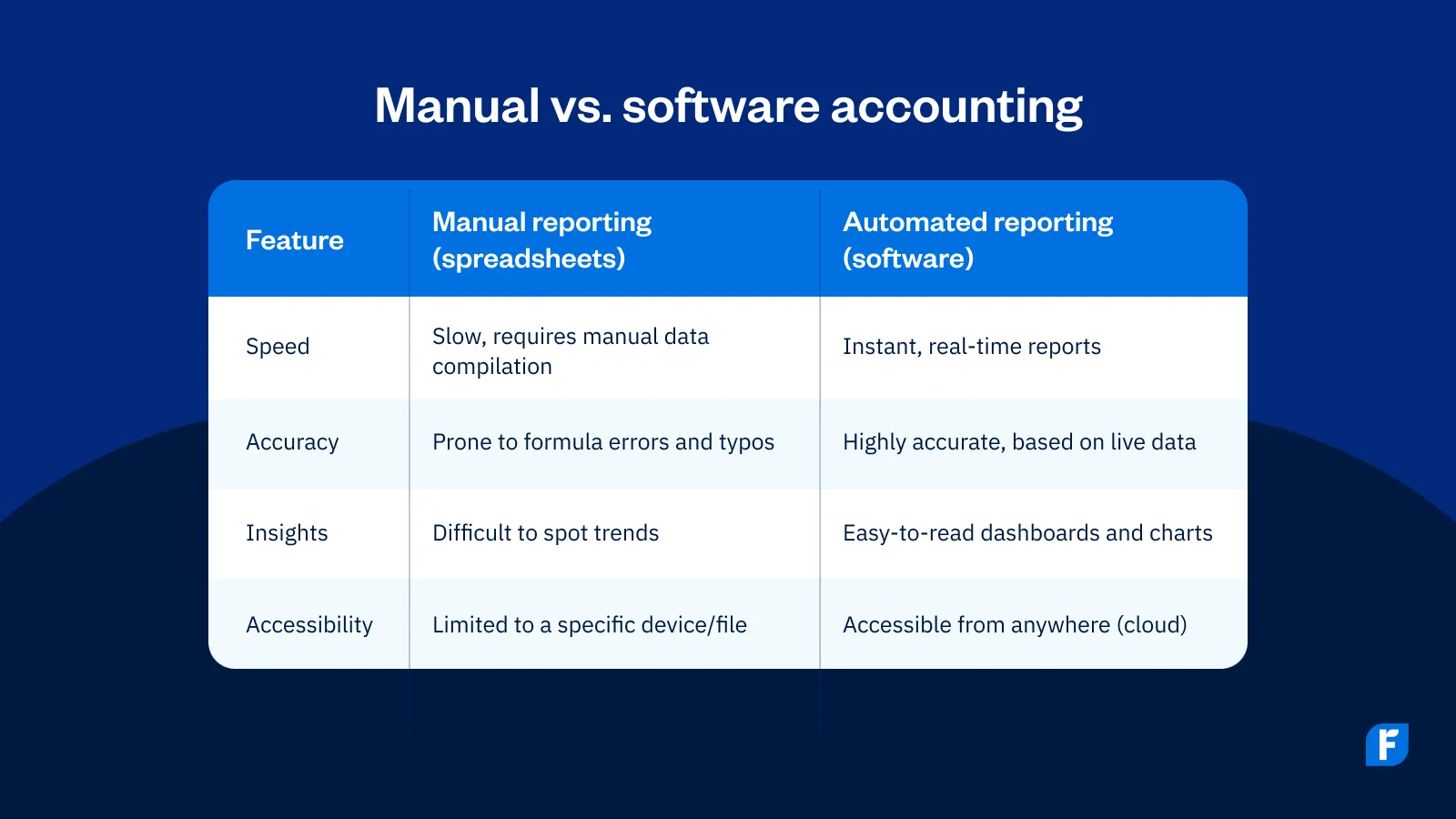 Take a look at this breakdown of manual reporting vs. software-generated reporting used in accounting software to see how useful these tools can be: