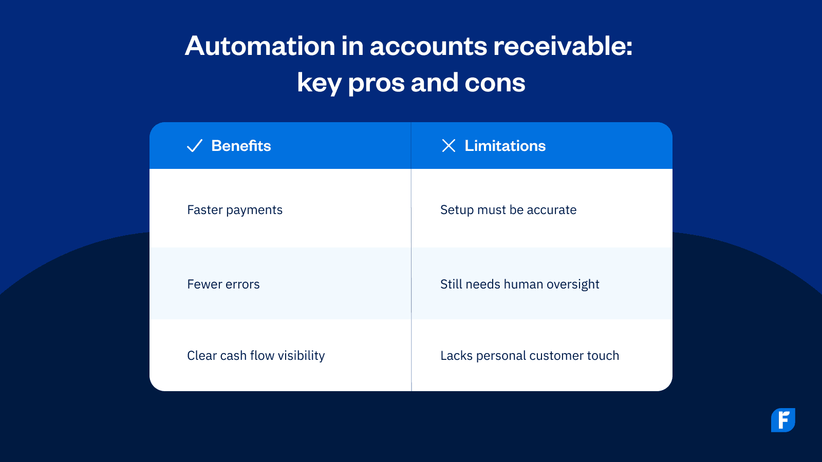 Automation isn’t simply magic. It’s more like a really good co-pilot. Accounts receivable automation takes the repetitive work off your plate, but it still relies on clean data, clear rules, and human judgment when things get messy. To get the most from your AR automation tools (and protect cash flow), plan for the spots where software can’t go it alone: data quality, edge cases, and customer conversations. Here are the key limitations to keep in mind before you automate your accounts receivable process.