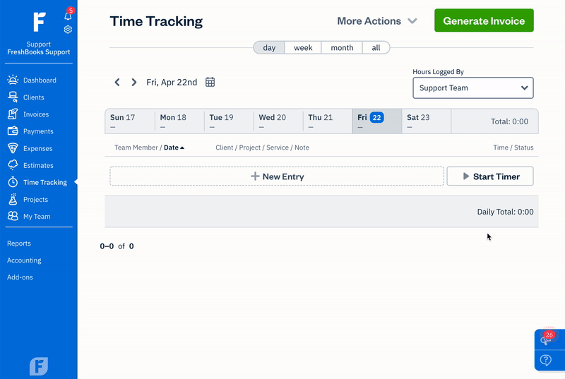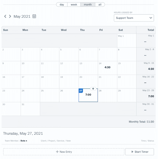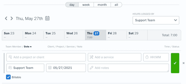 You can add time entries by day, week, or month for easy tracking. Daily time entries are helpful for starting new projects or for days when you need to log a variety of different projects or tasks.