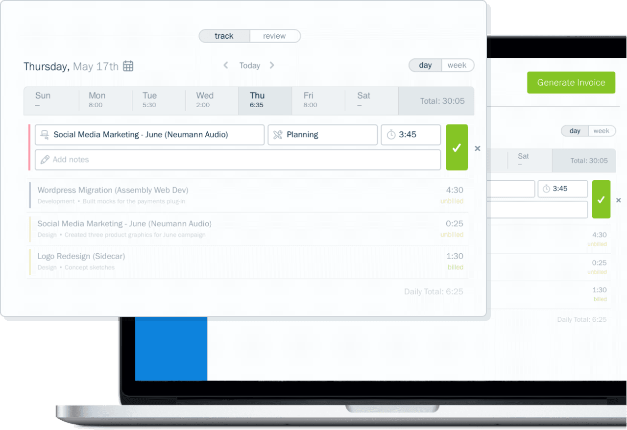 FreshBooks time tracking software provides an easy and efficient system for tracking billable hours. Explore different tracking modes, categorize your time according to client and project, and then create and send a professional invoice for your billable hours with FreshBooks invoicing software. Try FreshBooks for free to get started tracking your billable hours today.
