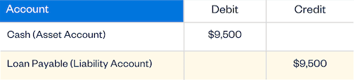 You are approved for a business loan of $9,500. When you receive the money, your cash increases by $9,500, and your loan liability increases by $9,500.