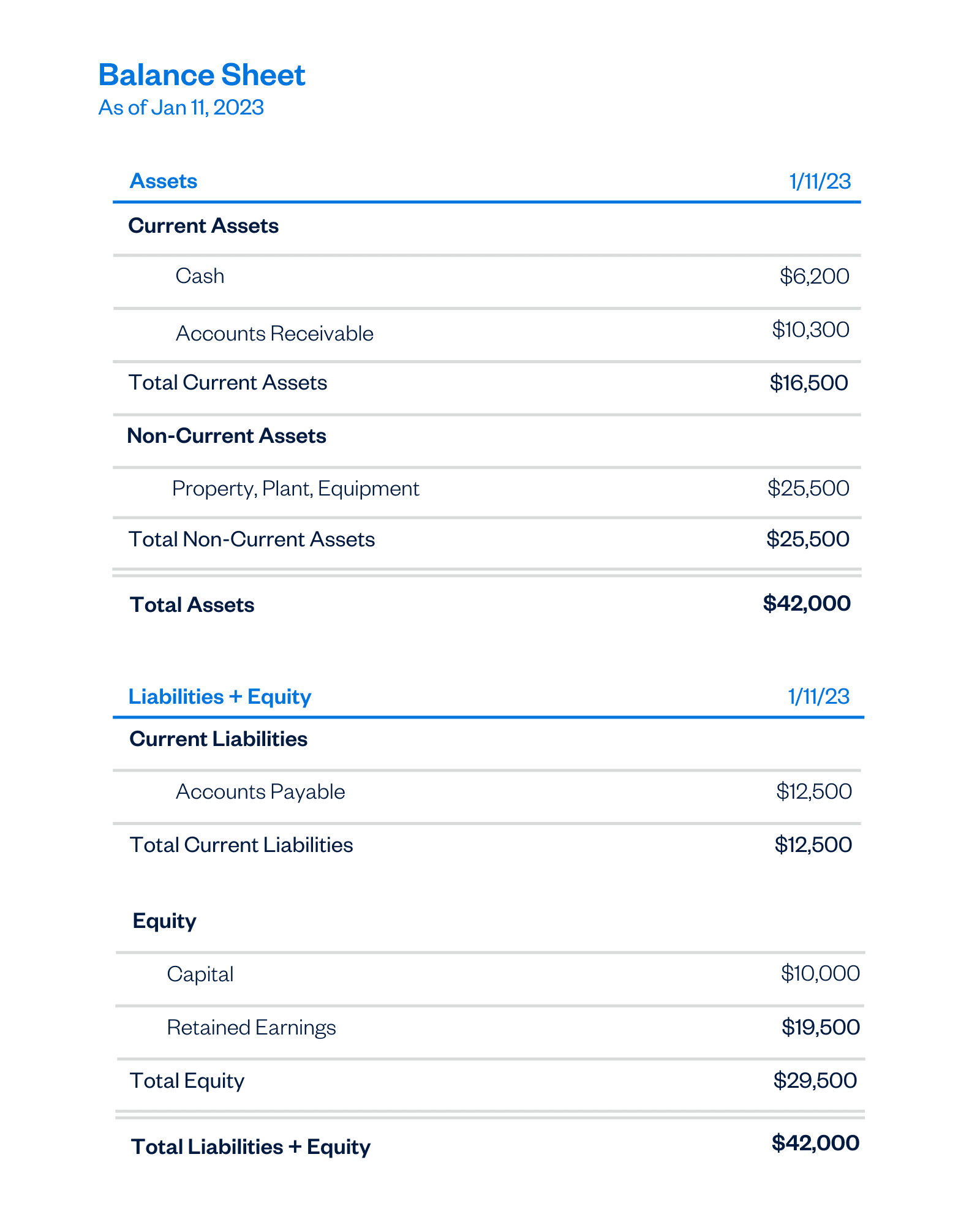 Because your total assets should equal your total liabilities plus equity, a balance sheet is sometimes laid out in two columns, with assets on the right and liabilities and equity on the left.