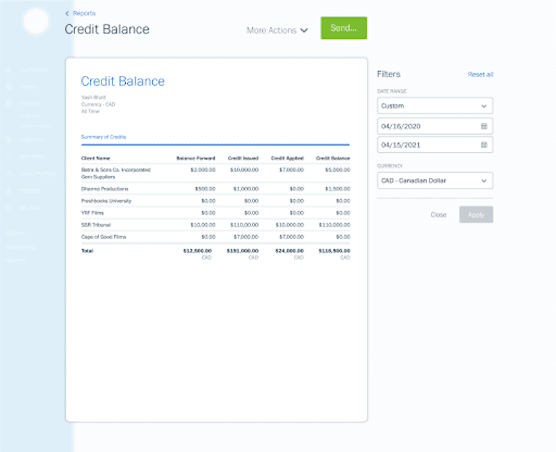 Alternatively, you can run a Credit Balance Report to see any balances, credits issued, and applied amounts tied to a particular client. Here’s what it looks like: