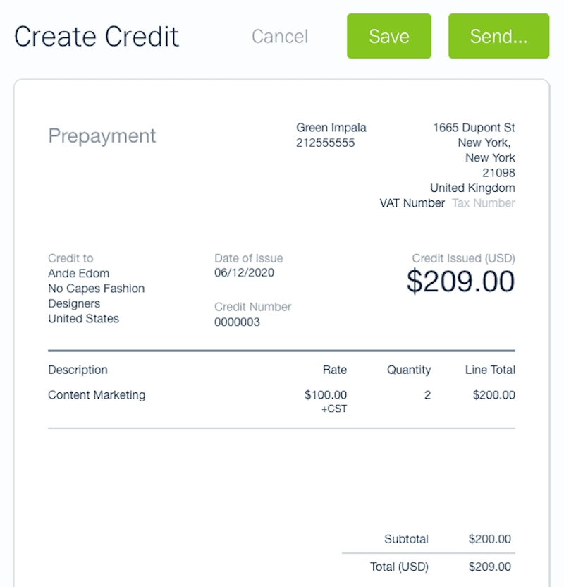 - Click Save to create the Credit, or click Send to email it directly to your Client