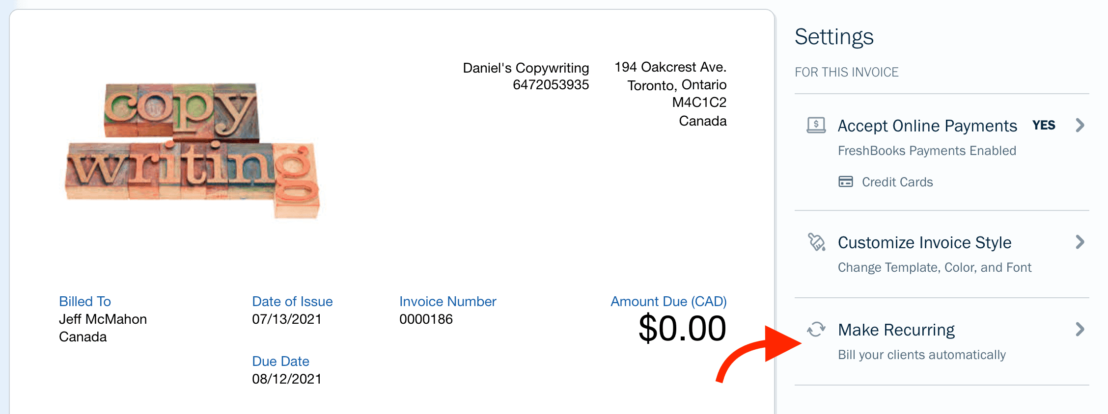 To get started with recurring invoices, simply enable the function when creating a new invoice in FreshBooks.