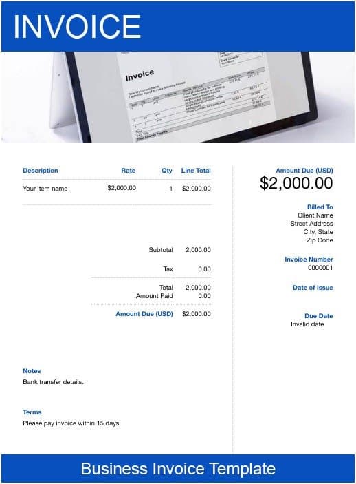 Create a header for your document and add your business logo at the top. If you’re making a business invoice in Microsoft Word, you can select a Word invoice template that will include a header with space for your logo. Invoice templates help ensure you’re including all pertinent information for a successful invoice.