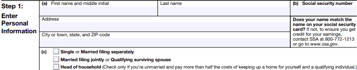 Fill in the sections for your name, address, and Social Security number. You will also want to determine your filing status and accurately fill this in. Your filing status options are: