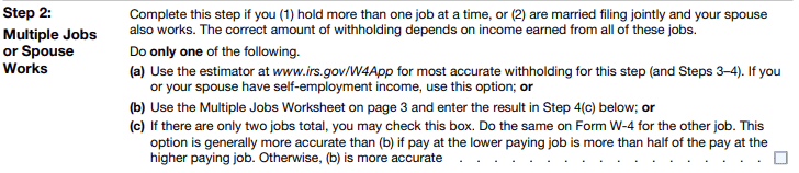 The updated form has a new “Step 2” section that prompts you to use the Internal Revenue Service Tax Withholding Estimator Tool. This tool will help you adjust your withholding amount to maximize benefits to your household (and your wallet). This is especially helpful to those with multiple jobs and those filing jointly with their spouses.
