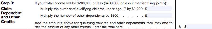 If you earn less than $200,000 per year as a single filer or less than $400,000 per year if married filing jointly, you can follow the steps on your W-4 form to include the $2,000 in credit for each dependent under 17 years of age and $500 for other dependents.