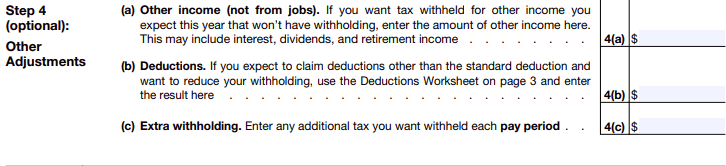 Once you have completed the other steps, you can tweak your deductions for extra withholding You may wish to have your primary place of employment hold back more taxes if you have other income from a non-traditional job or investments, or if you have other income or deductions you want to account for where no tax is deducted.